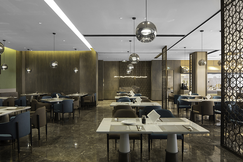整体空间以温润的高级白贯穿其中,点缀深蓝及大地色,深谙克制平衡之道,让一切和谐共融。同时引入现代建筑设计手法,不同材质穿插组合,引入大量的自然光线,旨在让旅客在细腻的浸润中,享用美食大餐!